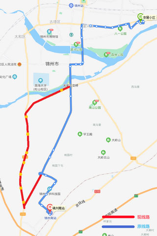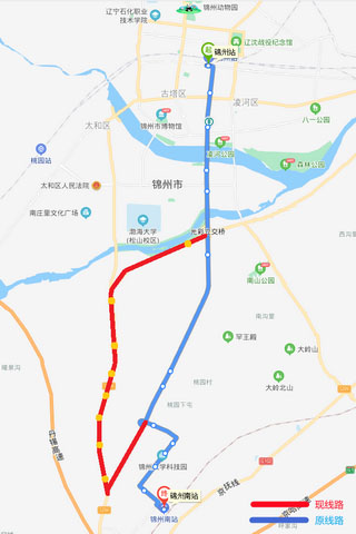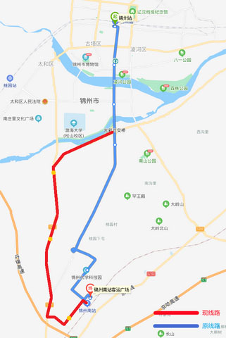 K1路 從2021年5月8日開始,因阜錦線南山西側(cè)隧道封閉施工,K1路(錦州站—錦州南站方向)運(yùn)行車輛無法正常通行,由中央南街改行南廣路、凌西大街、渤海大道、泰山路至錦州南站,不經(jīng)過金城御瀾山暻園和錦州大學(xué)科技園2處單側(cè)公交站點。增設(shè)公交三公司(215路)車輛管理所(215路)和航星集團(tuán)(215路)共3站。待道路具備通行條件后,立即恢復(fù)運(yùn)行原線路;錦州南站—錦州站方向按原線路運(yùn)行。